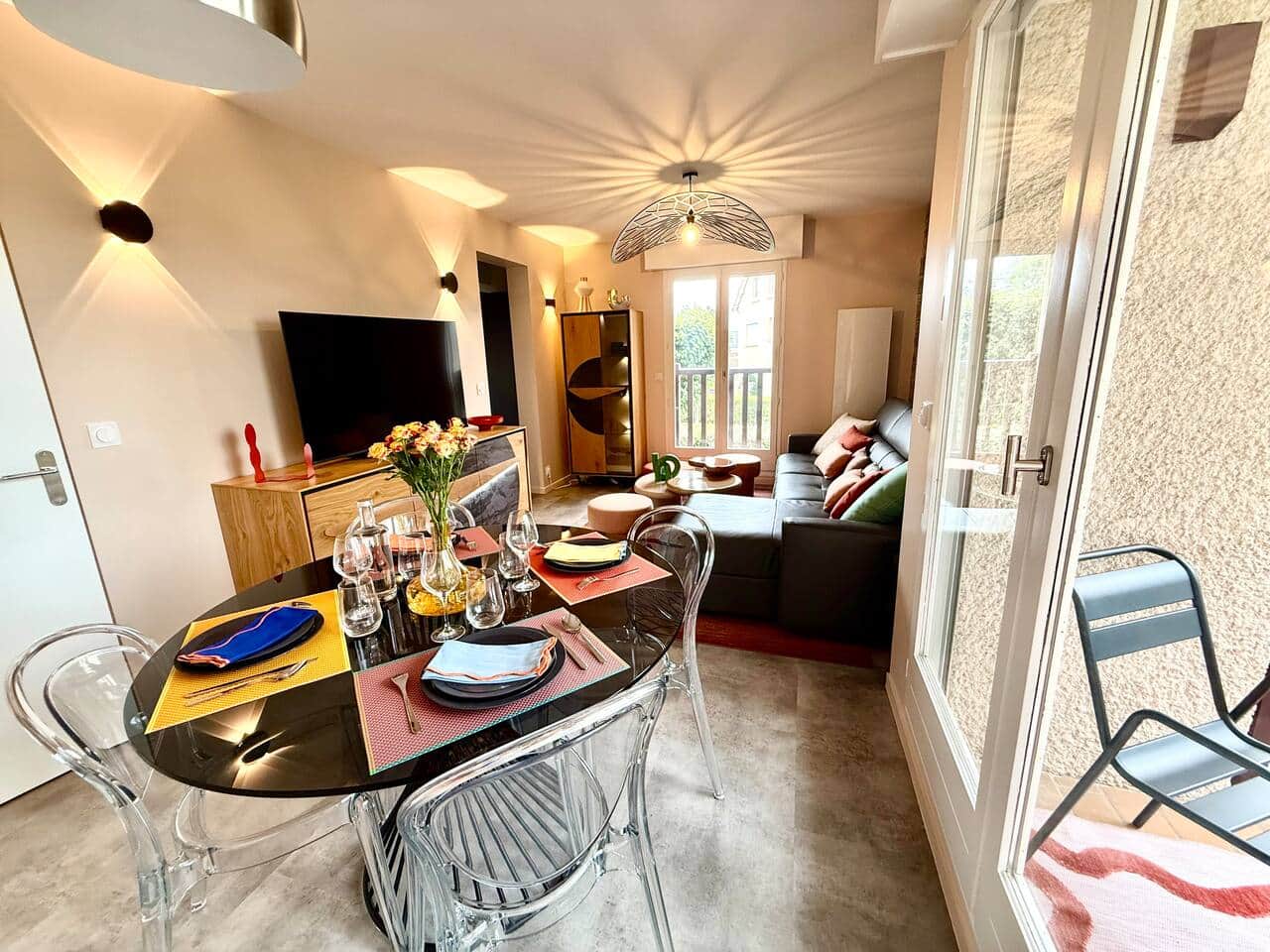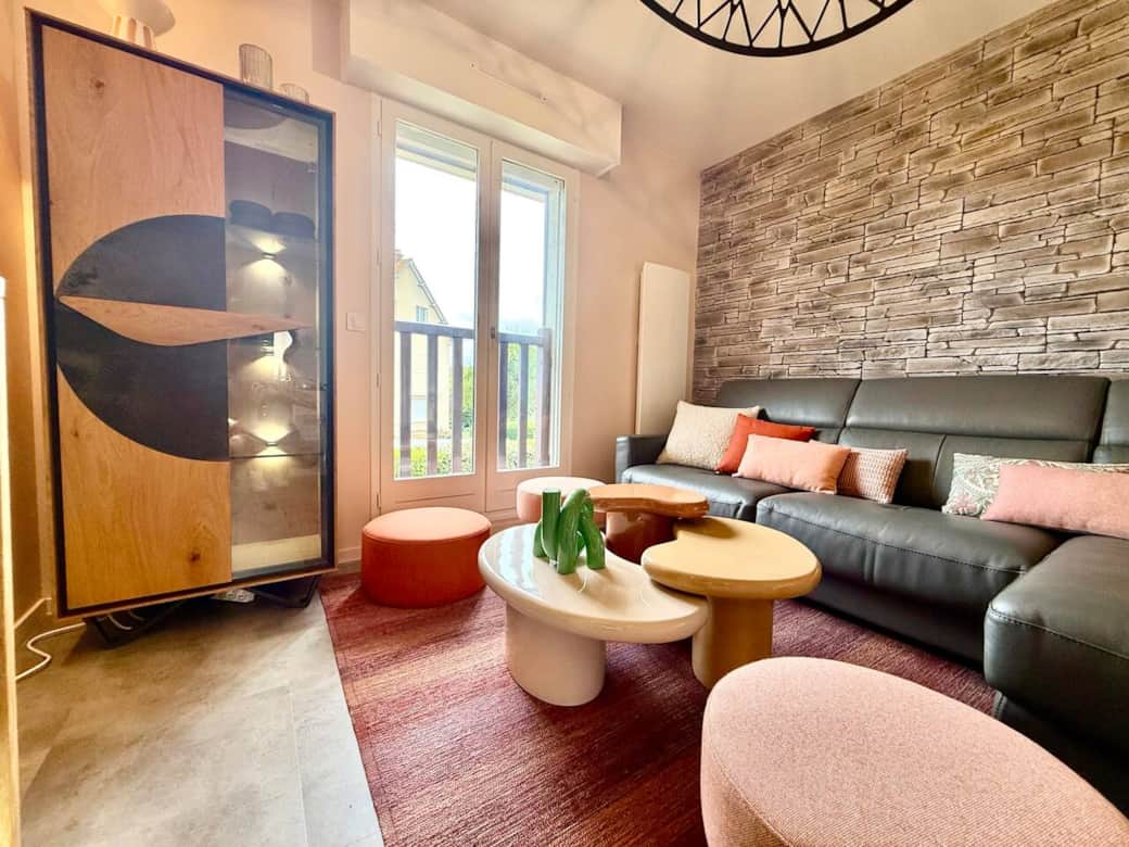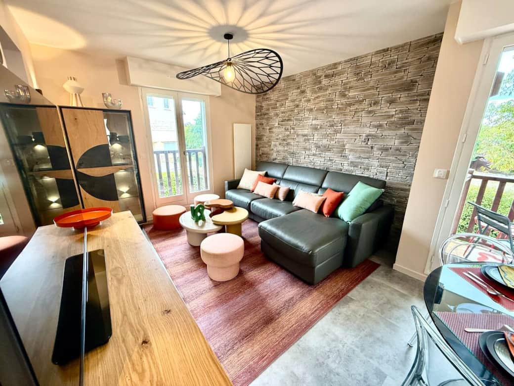 * Séjour lumineux avec décoration soignée, TV écran plat et accès balcon.